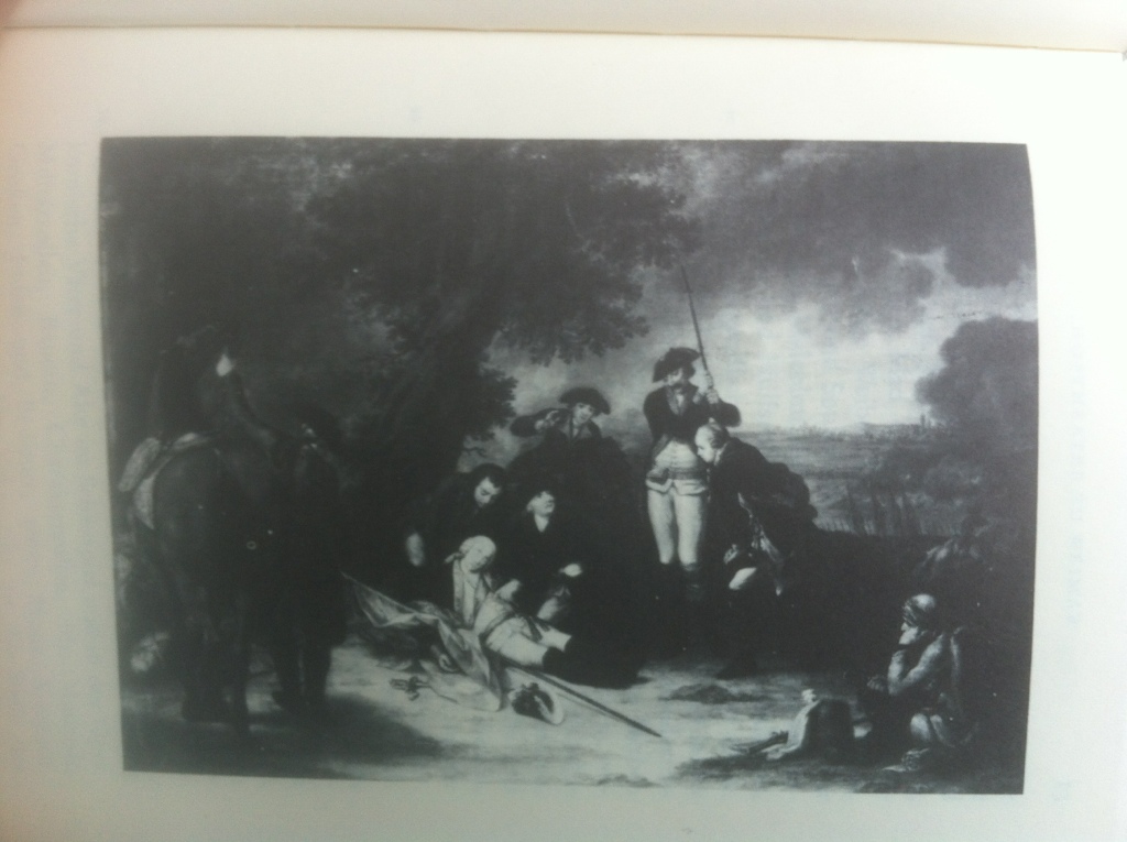 Da der Tod eines Generals vorzustellen war, so ist natürlich, daß die Komposition an den Tod des Generals Wolf, so wie ihn West vorgestellt, erinnern muß, da dieser Künstler gewissermaßen das Sujet erschöpft hat. Auch waren ihm die Umstände günstiger. Wolf wird noch lebend vorgestellt, als er in seinen letzten augenblickendie Nachricht des Sieges vernimmt. Das fremde Kostüme zwischen dem Europäischen mgibt dem Bilde Lokalität und Mannigfaltigkeit. Doch hat Herr Frisch durch die Figur eines verwundeten Husaren, welcher im Vordergrunde sitzt und durch die Abwechslung der übrigen Kleidungen, so viel es sich tun ließ, der Komposition von dieser Seite Interesse zu geben gewußt.