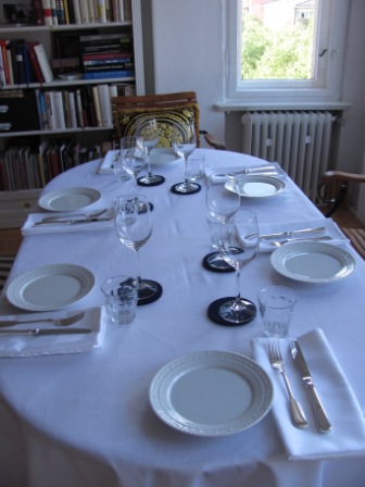 Gestern abend waren Freunde zum Essen und Plaudern eingeladen. Ich hatte keine Zeit, groß zu kochen, also habe ich schönen Käse, Schinken und Baguette gekauft, einen bunten Salat gemacht und Wein aus dem Keller geholt. Den Tisch habe ich ohne großen Aufwand gedeckt, viel Platz ist bei sechs Personen ja auch nicht, wenn Platten und die Salatschüssel unterkommen müssen.