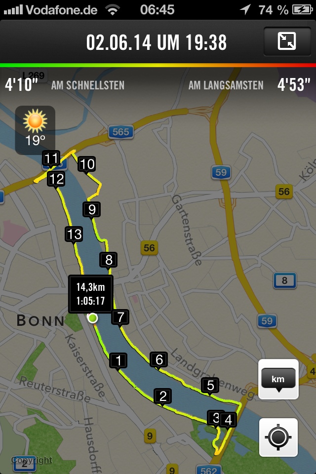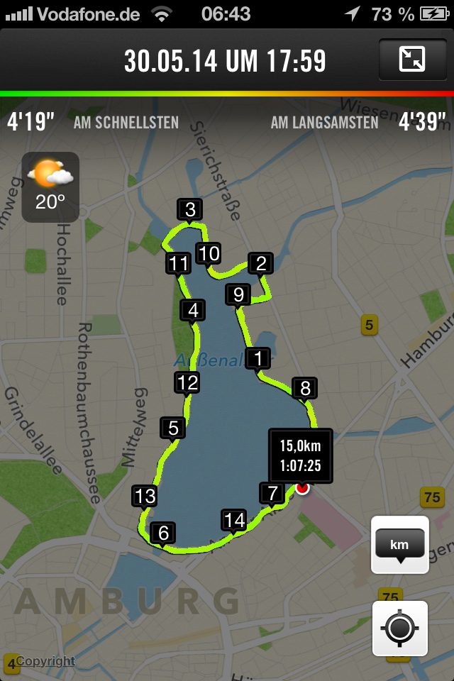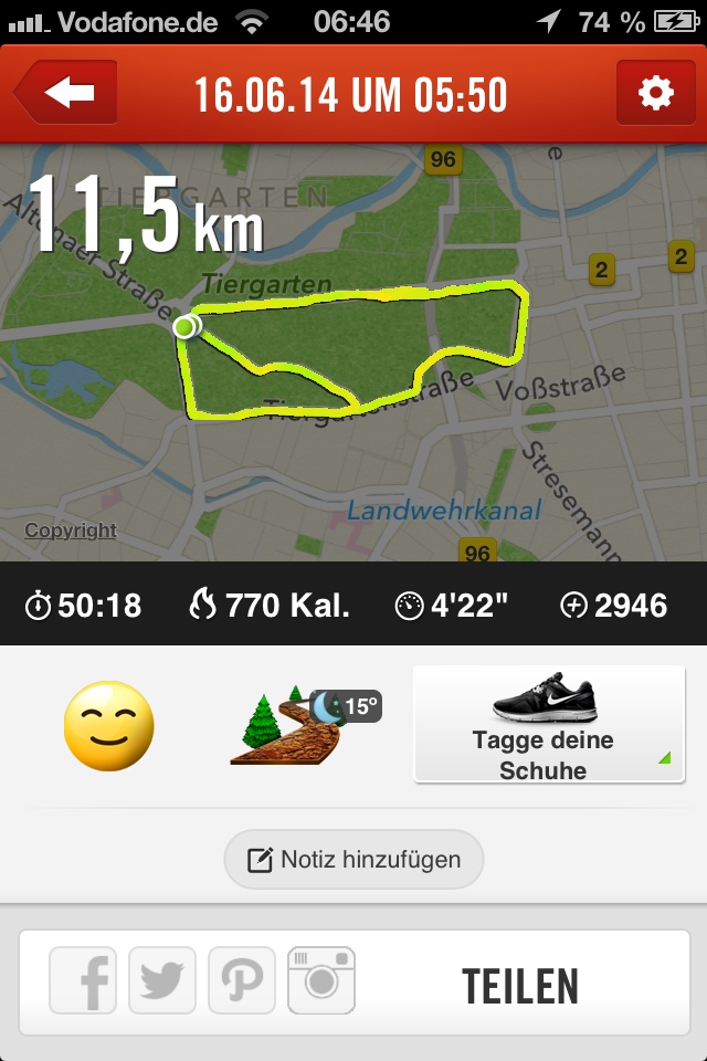 Meine Hausstrecke ist aber der Berliner Tiergarten, auch wenn da allzuoft Absperrungen für Großveranstaltungen wie FashionWeek oder jetzt die sogenannte Fan-Meile Hindernisse darstellen. Wozu haben wir denn das leere Tempelhofer Feld, wenn nicht für störende Großveranstaltungen…