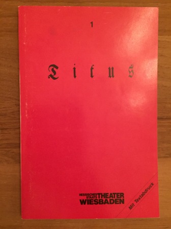 Dann, mit der neuen Intendanz, die neugestalteten Programmhefte, durchnumeriert. 22 finden sich über die nächsten Jahre in meinem Regal. Nr. 1 gilt der Eröffnungspremiere von Mozarts Titus, am Pult der ewige GMD Siegfried Köhler, Inszenierung Marcel Bluwal, Ausstattung Hubert Monloup. In der Titelrolle Jonathan Welch, Vitellia Sue Patchell, Sextus Graciella Alperyn, Servilia Györgyi Benza, Annius Marion Meyerolbersleben, Publius David Cumberland. Es war meine erste und bislang einzige Begegnung mit dem Werk. Das muß nicht so bleiben. Auch Anregungen resultieren also aus diesem kleinen Blogprojekt.