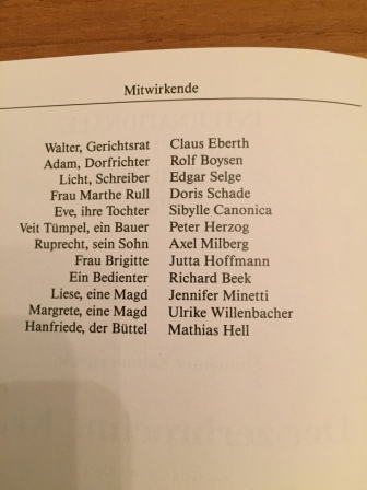 Aber auch die Müncher Kammerspiele waren in Wiesbaden zu Gast. Kleists Zerbrochener Krug (1987), in der Titelrolle Rolf Boysen, Edgar Selge als Schreiber, Axel Milberg als Ruprecht. Ein Jahr später Racines Phädra mit der großen Gisela Stein in der Titelrolle, Thomas Holtzmann als Theseus und Manfred Zapatka als sein Sohn Hippolytos.