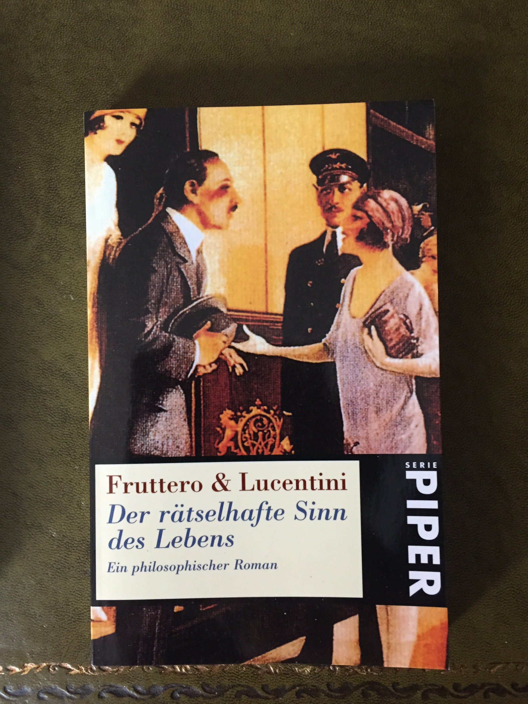 Diese vier jedenfalls finden sich in meinen Bücherregalen und Taschenbuchschubladen. Es handelt sich, so die recht ähnliche Beschreibung auf den Verlagsseiten, bei Wikipedia und einem großen Internethändler, um Gesellschafts- und Kriminalromane, die die Zustände im seinerzeitigen Italien kritisch-liebevoll reflektierten. Meine Erinnerung ist am stärksten in Hinsicht auf die »Pineta«, weil ich das Buch bestimmt drei oder vier Mal gelesen habe. Ein scharfer Blick auf die Angehörigen der italienischen Oberschicht in einer exklusiven Ferienwohnanlage; natürlich haben alle etwas zu verbergen und trauen sich gegenseitig nicht über den Weg. Amüsant und spannend dazu. Im »Fall D.« sind die besten Detektive der Kriminalliteratur versammelt, um einen unvollendeten Roman von Charles Dickens fort- und seiner Lösung zuzuführen. Das Buch las ich nur einmal, weil ich den Sound der Detektive, soweit ich sie kannte, nicht richtig getroffen fand; insgesamt habe ich ferner eine gewisse Langatmigkeit in Erinnerung. Danach las ich dann auch keine weiteren Bücher von F&L mehr. An die beiden anderen Titel habe ich keine Erinnerung mehr; vom »Liebhaber« wußte ich immerhin noch, wie das Buch aussieht, der Besitz des »rätselhaften Sinns« überraschte mich hingegen. Soviel zur Ausgangslage. Was würde ein Wiederlesen erbringen? Das war die Anschlußfrage und gleichzeitig der Ausgangspunkt eines neuen, kleinen Leseprojekts. Zunächst kurz ein paar Fakten: Carlo Fruttero (1926–2012) und Franco Lucentini (1920–2002) lernten sich Ende der 1950er Jahre beim Verlag Einaudi in Turin kennen. 1972 erschien ihr erster gemeinsamer Roman »Die Sonntagsfrau«. Der rätselhafte Sinn des Lebens. Ein philosophischer Roman, 1975, dt. 1995.