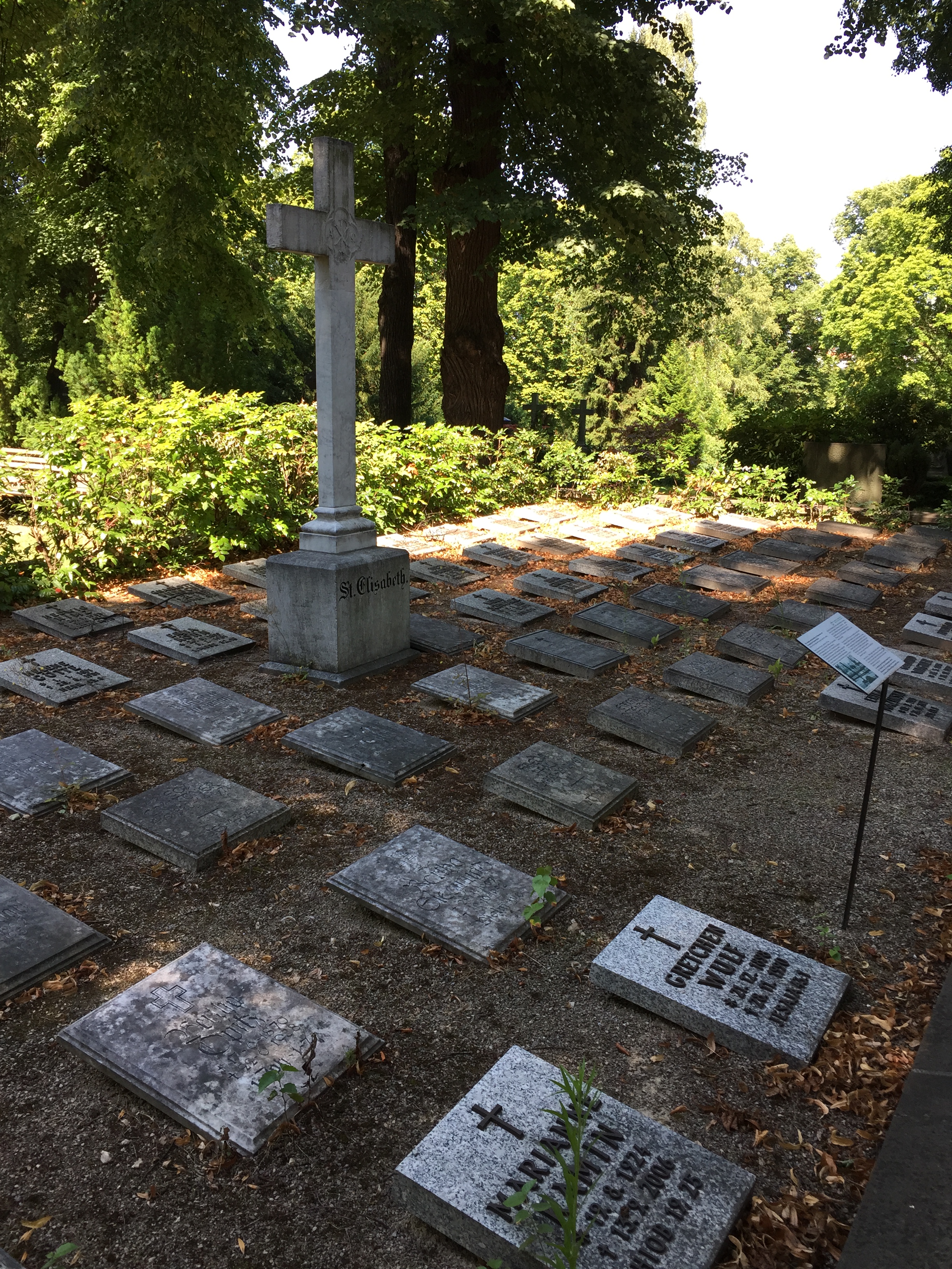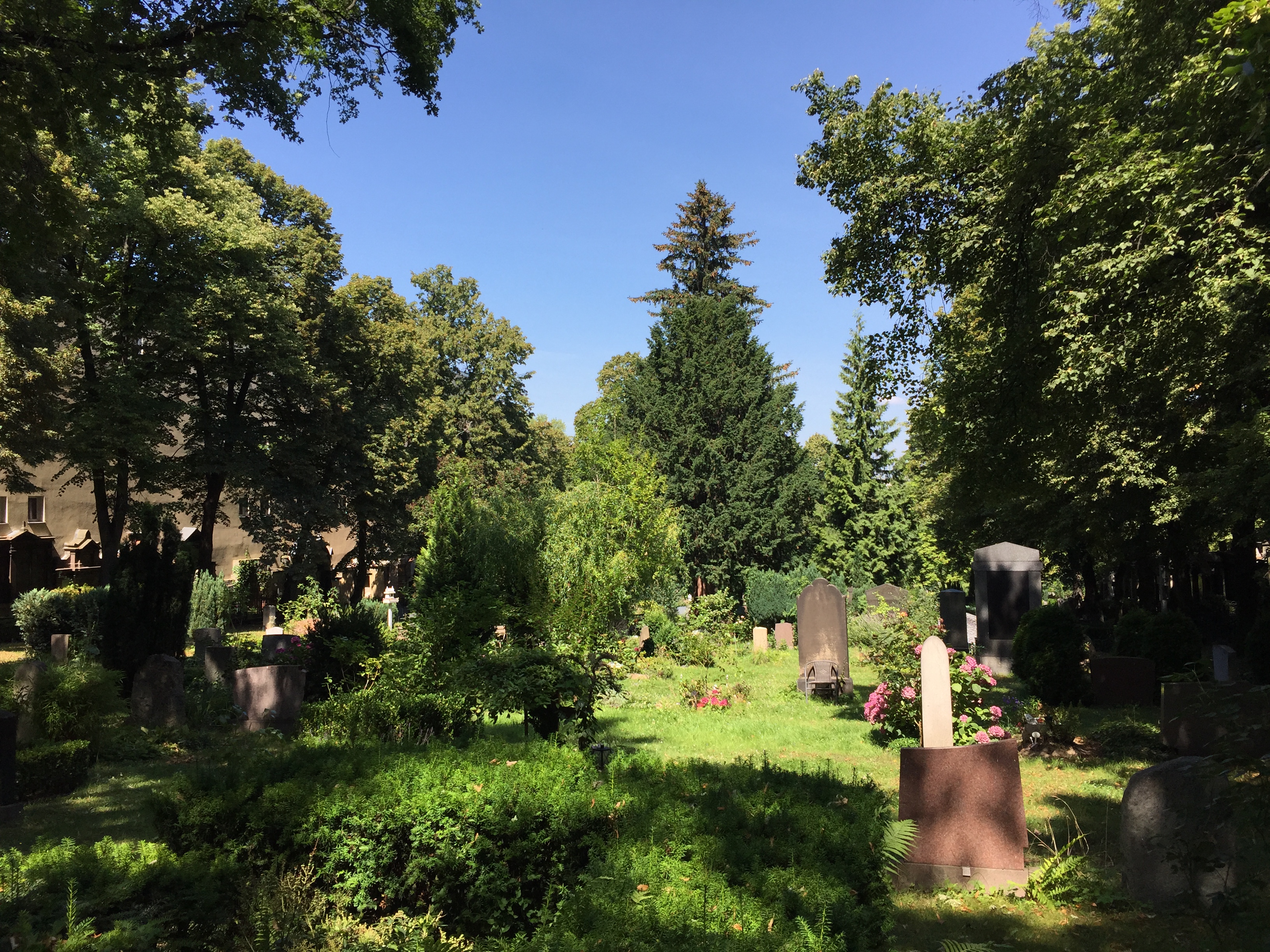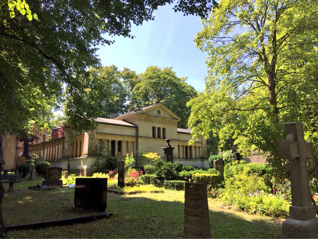 Bei der Zwischenstation auf dem Friedhof habe ich mich an die #gruftwandeln-Aktionen erinnert, die man auf Twitter unter dem vorgenannten Hashtag und auch auf dem Blog Kulturfritzen gelegentlich verfolgen kann. Und dann bin ich eben ein wenig umhergeschlendert. Der Friedhof hat, wie man bei Wikipedia nachlesen kann, eine wechselvolle Geschichte hinter sich. Daß er mal den besseren Ständen zur letzten Ruhestätte diente, sieht man ihm heute noch ebenso an wie die Tatsache, daß es einmal zu einem Eingriff gekommen sein muß. Es waren die Nationalsozialisten, die für ihre Reichshauptstadt Germania Platz brauchten und Umbettungen vornahmen. Heute gibt es Abteilungen für sogenannte Sternenkinder, also Tot- und Fehlgeburten sowie wenige Tage nach der Geburt gestorbene Babys. Einige Grabstätten dienen auch der Erinnerungen an Menschen, die an HIV/Aids gestorben sind.